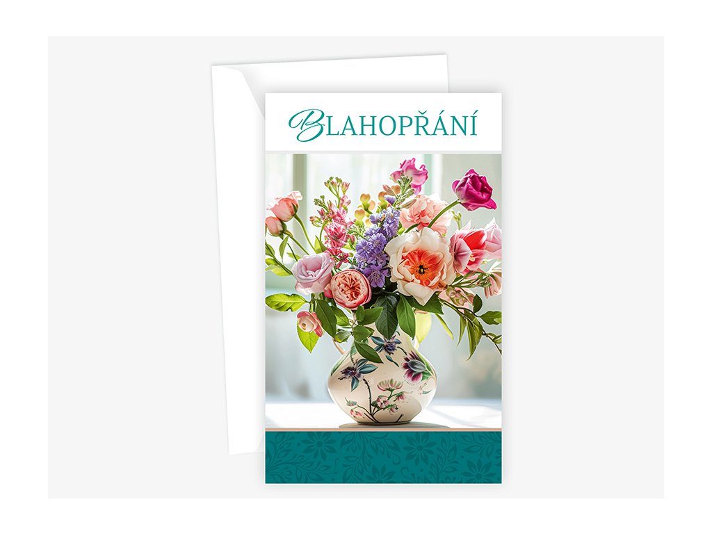 Srdečné blahopřání s textem uvnitř přání. Součástí blahopřání je bílá obálka.
