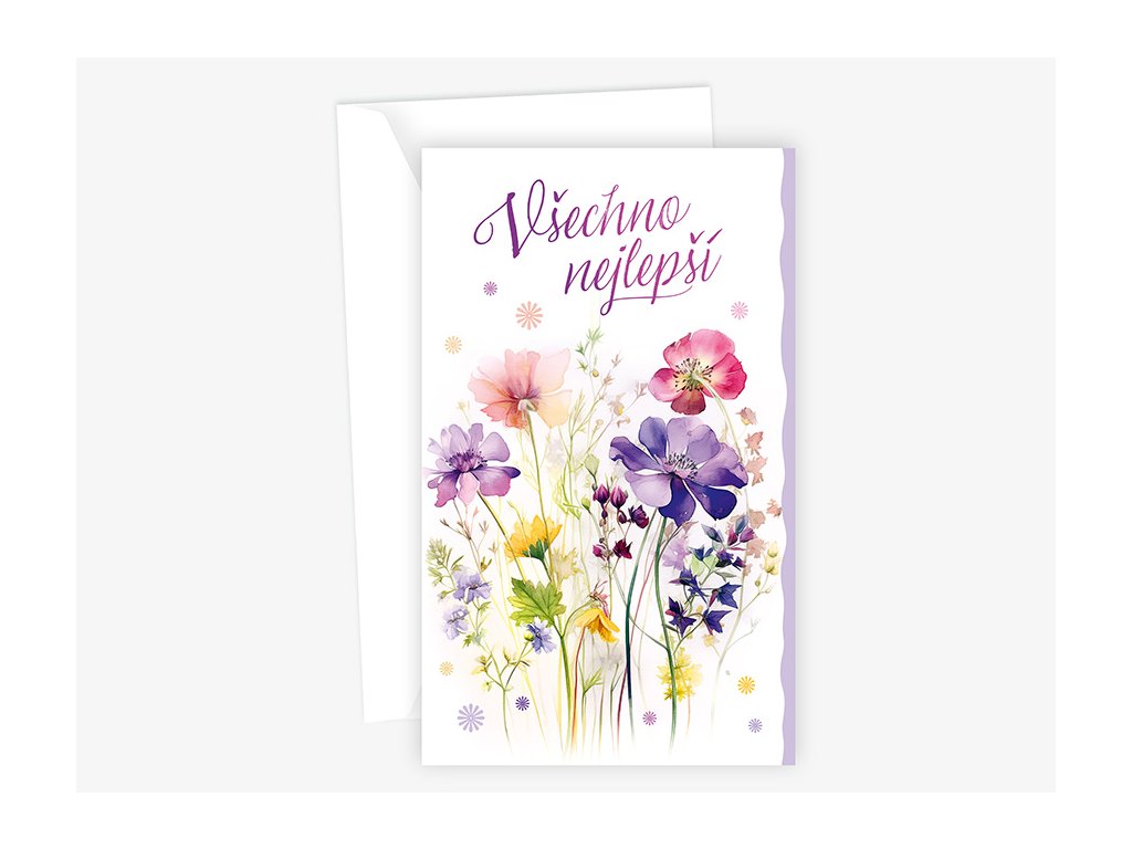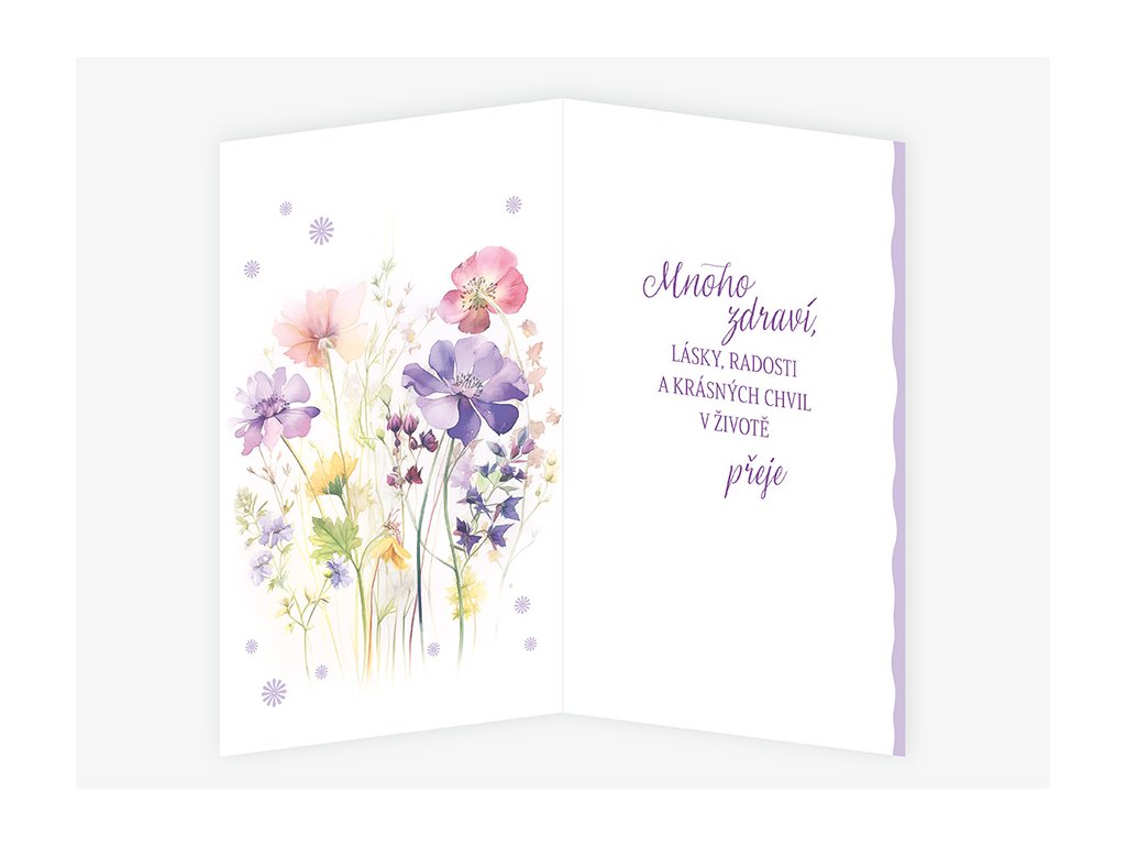 Srdečné blahopřání s textem uvnitř přání. Součástí blahopřání je bílá obálka.