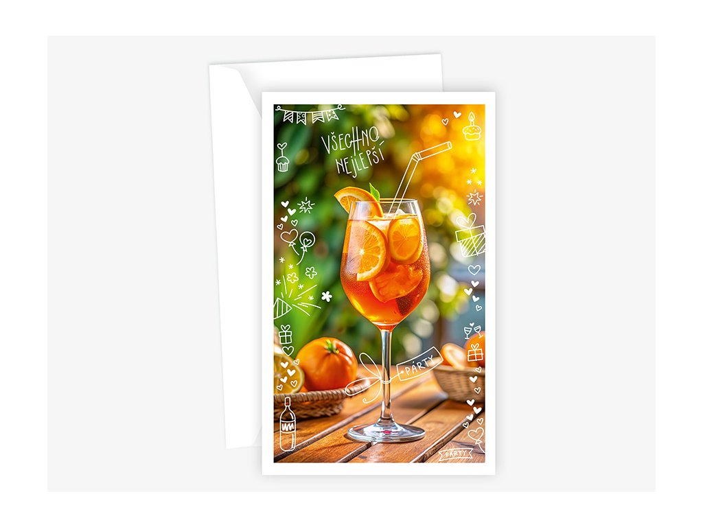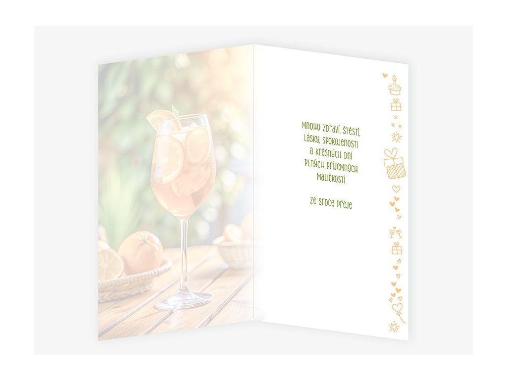 Srdečné blahopřání s textem uvnitř přání. Součástí blahopřání je bílá obálka.