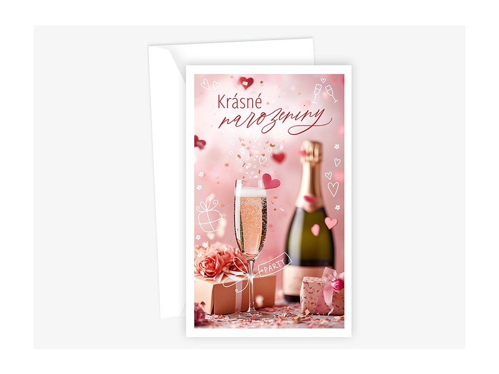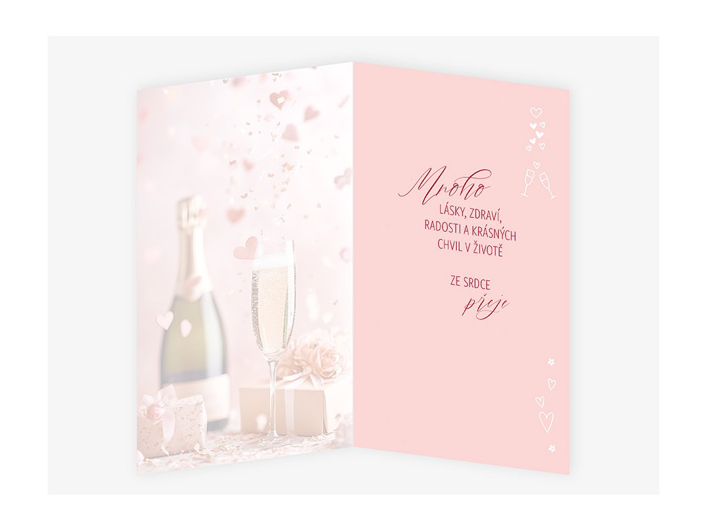 Srdečné blahopřání s textem uvnitř přání. Součástí blahopřání je bílá obálka.