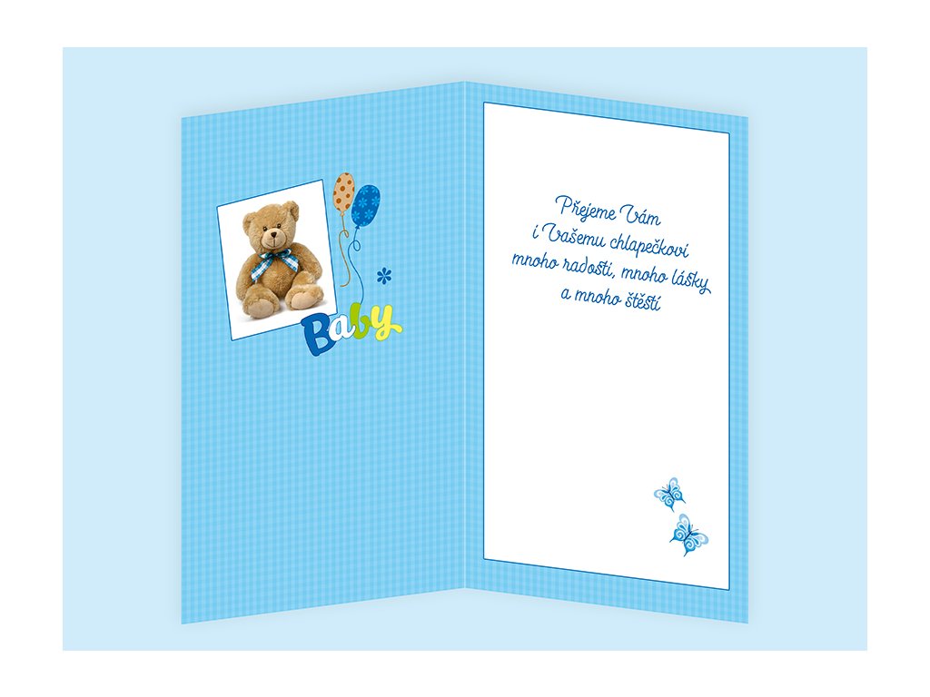 Blahopřání k narození dítěte s textem uvnitř přání. Součástí blahopřání je bílá obálka.