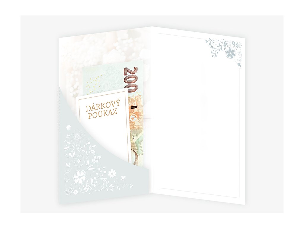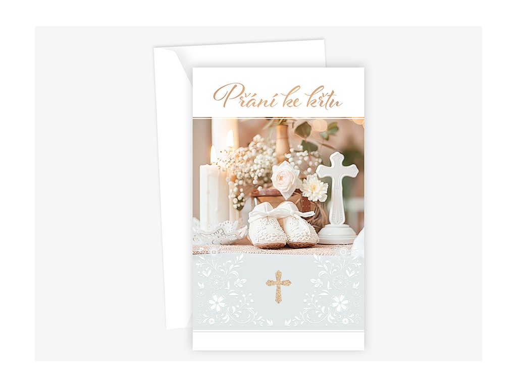Blahopřání ke křtu s kapsou na peníze bez textu uvnitř přání. Součástí blahopřání je bílá obálka.