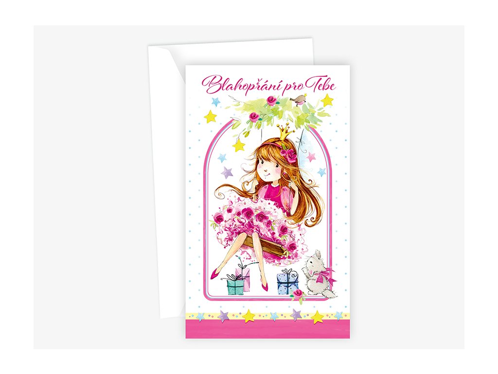 Srdečné blahopřání pro děti s textem uvnitř přání. Součástí blahopřání je bílá obálka.