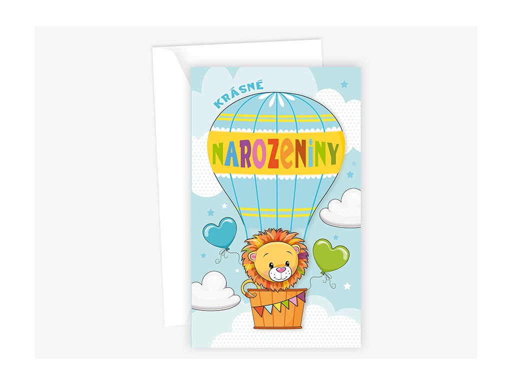 Srdečné blahopřání pro děti s kapsou na peníze a textem uvnitř přání. Součástí blahopřání je bílá obálka.