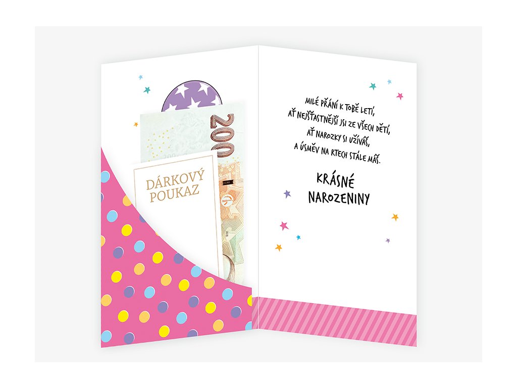Srdečné blahopřání pro děti s kapsou na peníze a textem uvnitř přání. Součástí blahopřání je bílá obálka.