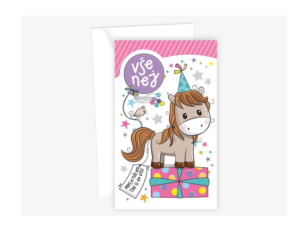 Text uvnitř: Milé přání k tobě letí, ať nejšťastnější jsi ze všech dětí, ať narozky si užíváš a úsměv na rtech stále máš. Krásné narozeniny