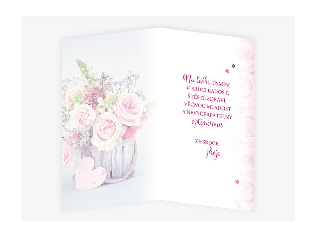 Text uvnitř: Na tváři úsměv, v srdci radost, štěstí, zdraví, věčnou mladost a nevyčerpatelný optimismus ze srdce přeje