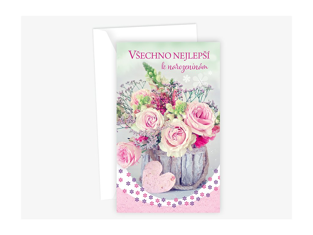 Srdečné blahopřání s textem uvnitř přání. Součástí blahopřání je bílá obálka.