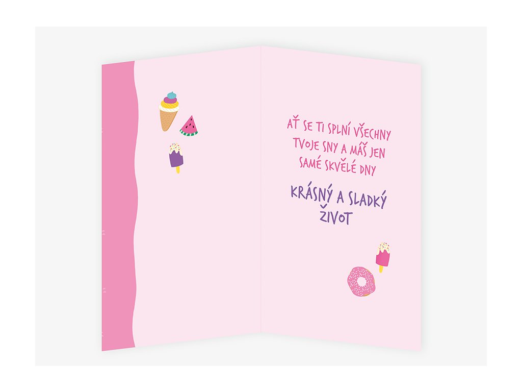 Text uvnitř: AŤ SE TI SPLNÍ VŠECHNY TVOJE SNY A MÁŠ JEN SAMÉ SKVĚLÉ DNY. KRÁSNÝ A SLADKÝ ŽIVOT