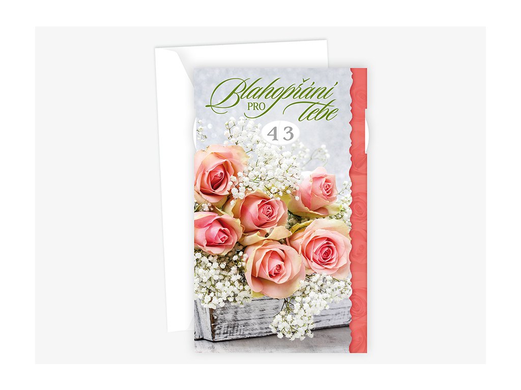 Srdečné blahopřání s výběrem roků a textem uvnitř přání. Součástí blahopřání je bílá obálka.