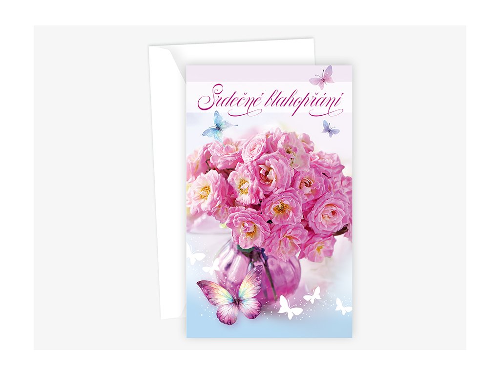 Srdečné blahopřání s textem uvnitř přání. Součástí blahopřání je bílá obálka.