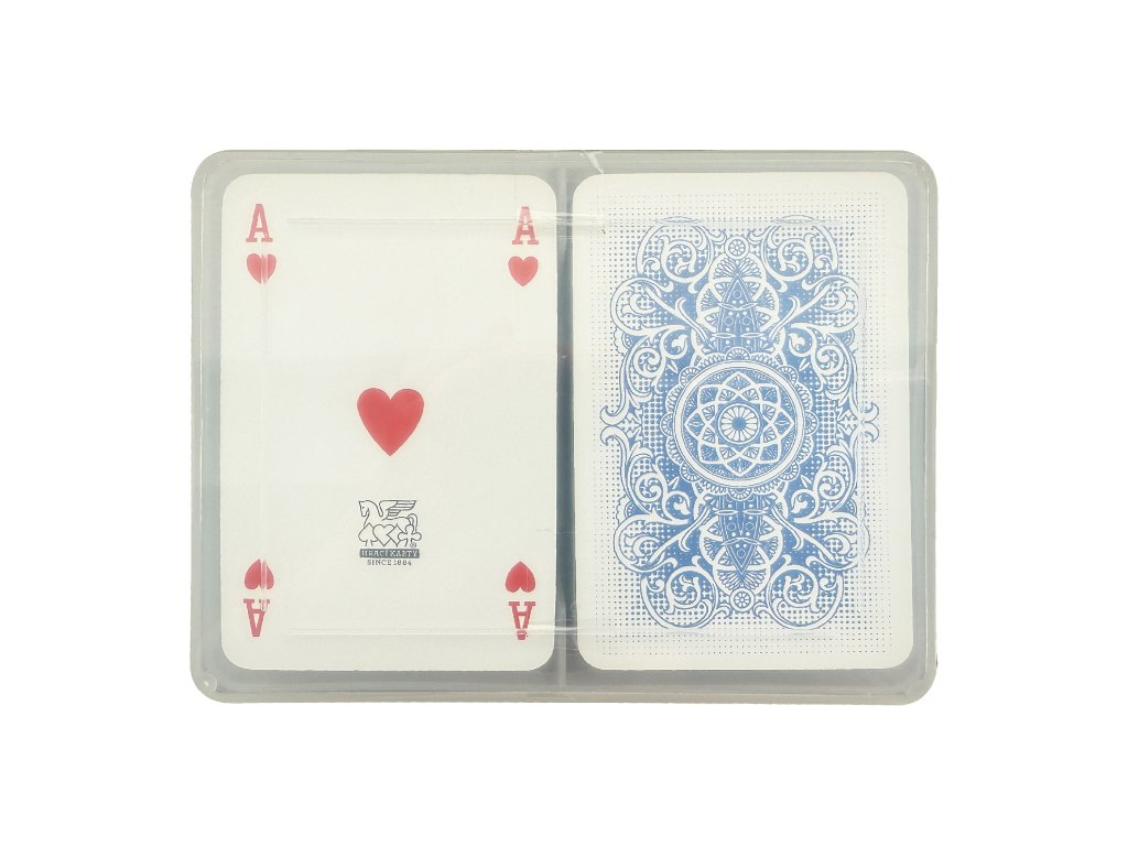 Canasta - dobře známý mezinárodní vzor těchto karet je stále populární u hráčů na celém světě. Revers je ve tvaru krajky v modrém a červeném provedení.