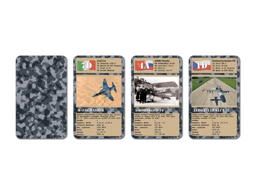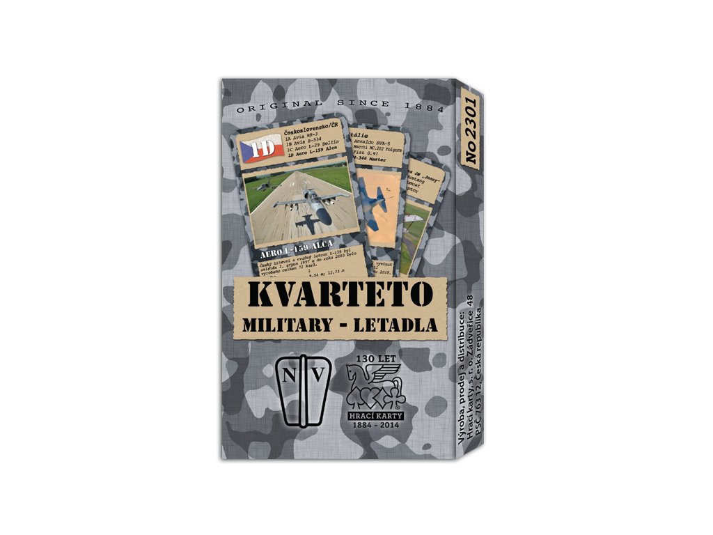 KVARTETO Military letadla - edice her Military přináší ve zcela originální grafice kvarteto s fotografiemi historických i současných válečných letadel. Hra vznikla ve spolupráci s nakladatelstvím Naše vojsko – knižní distribuce, s.r.o.