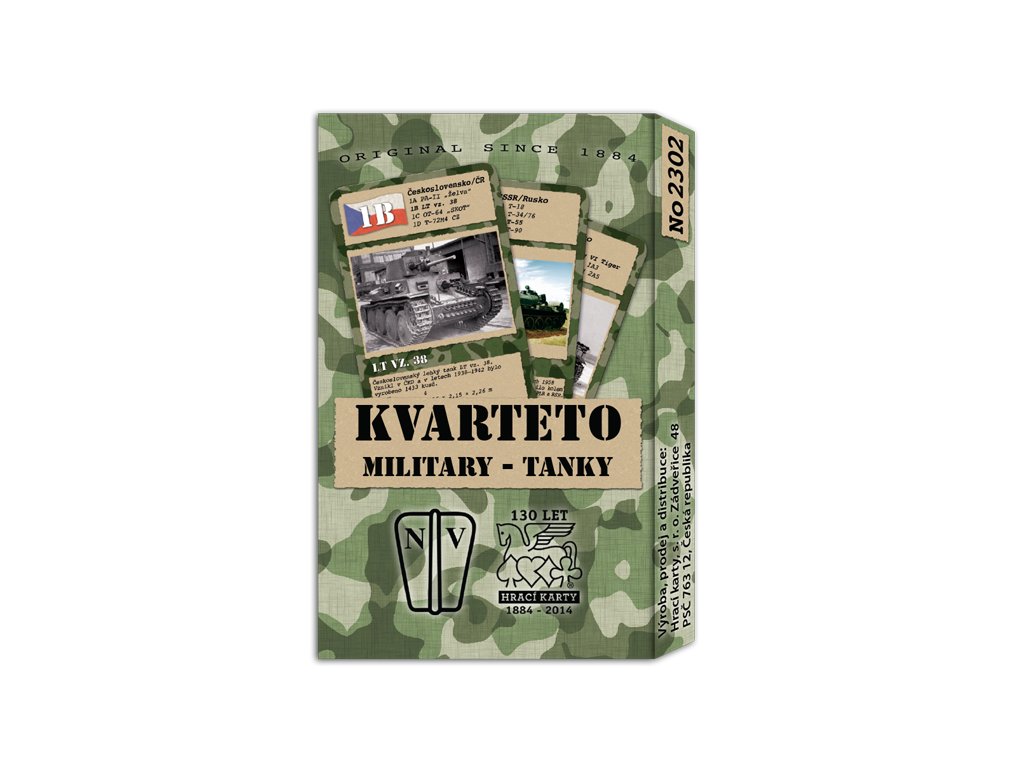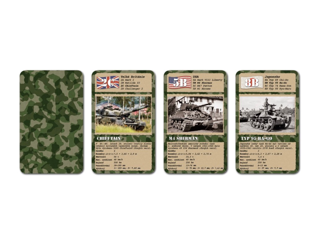 KVARTETO Military tanky - edice her Military přináší ve zcela originální grafice kvarteto s fotografiemi historických i současných válečných obrněných vozidel a tanků. Hra vznikla ve spolupráci s nakladatelstvím Naše vojsko – knižní distribuce, s.r.o.