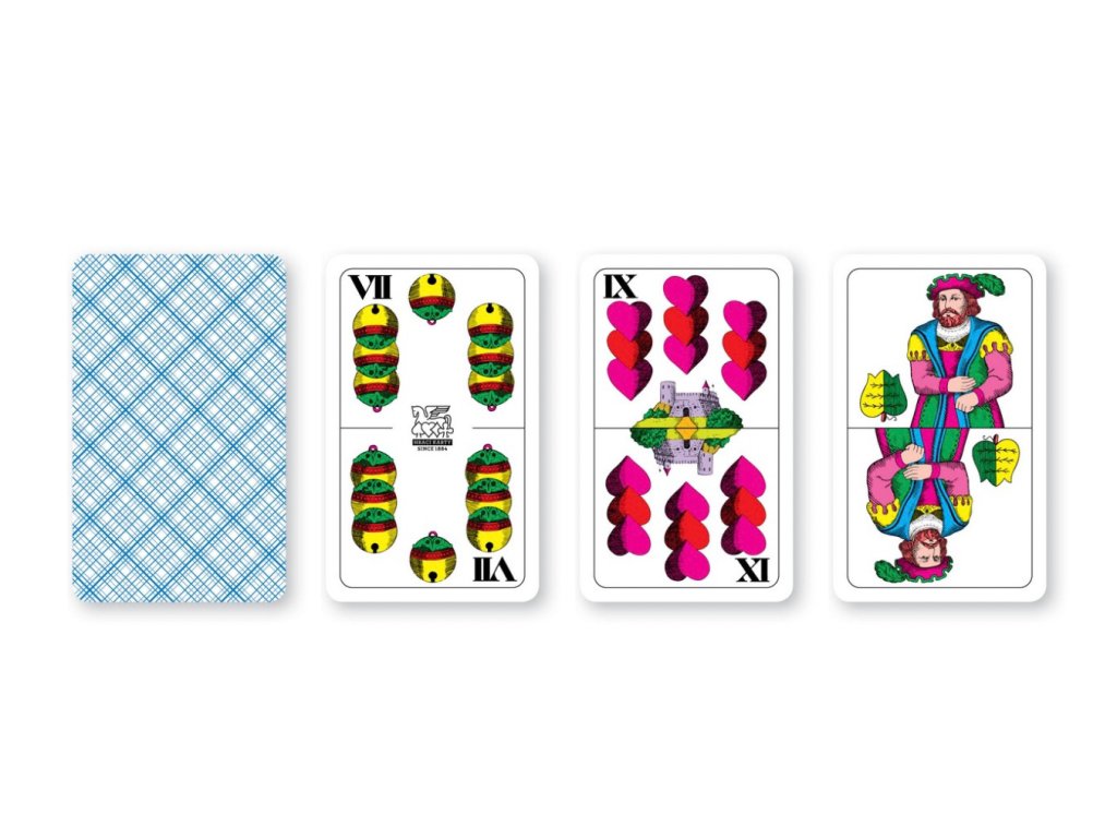 Mariáš dvouhlavý - herní sada zobrazuje na jednotlivých figurách legendu o Vilému Tellovi, obraz karet je s drobnými změnami stejný již 150 let. Obrazy jednotlivých es zobrazují roční období od jara do zimy. Károvaný revers je typický pro tuto hru. Mezi hráči je velmi oblíbený pro svoji praktičnost.