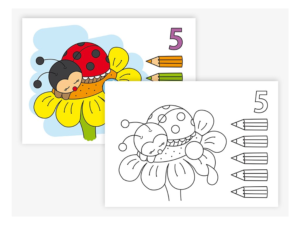 Osm stran barevné předlohy a osm stran k vybarvování, formát A5.