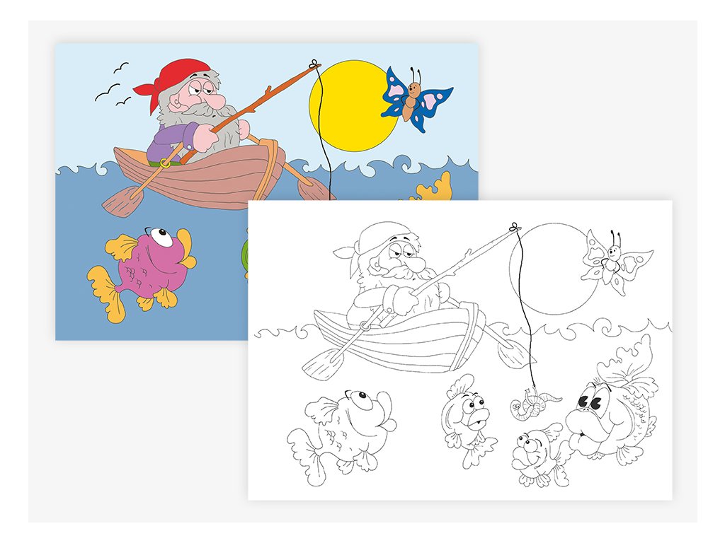 Osm stran barevné předlohy a osm stran k vybarvování, formát A5.