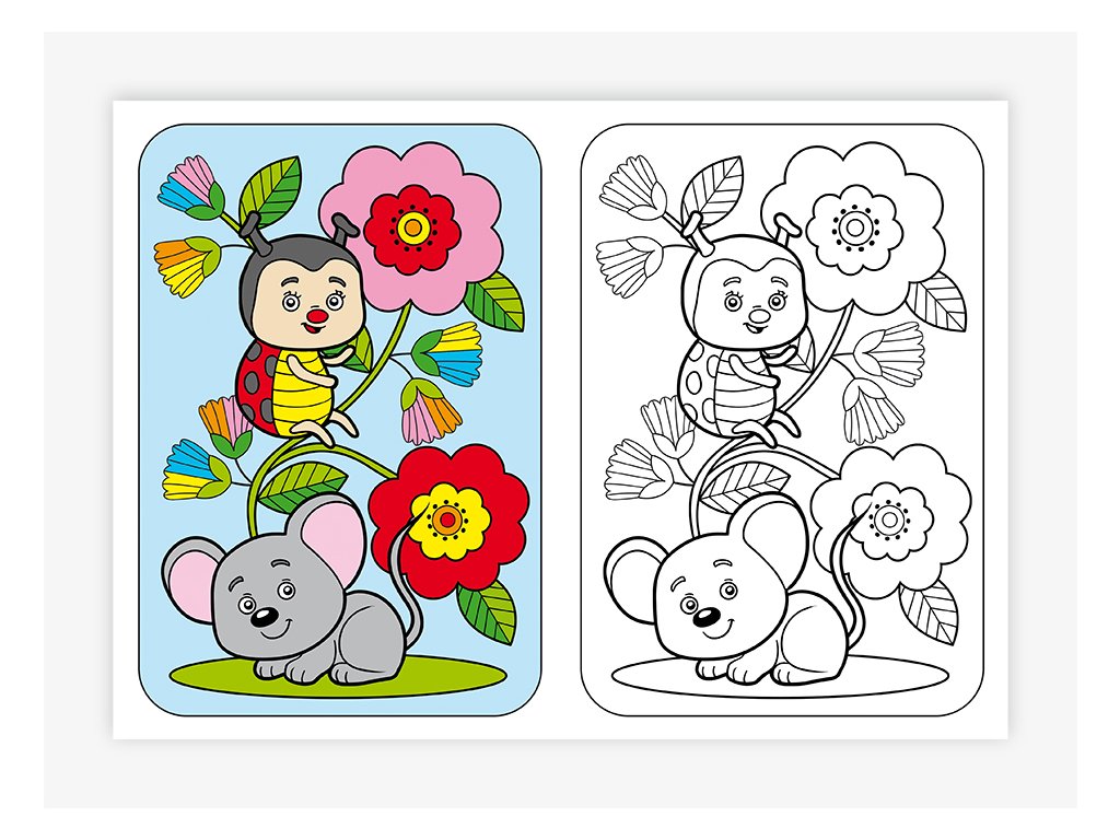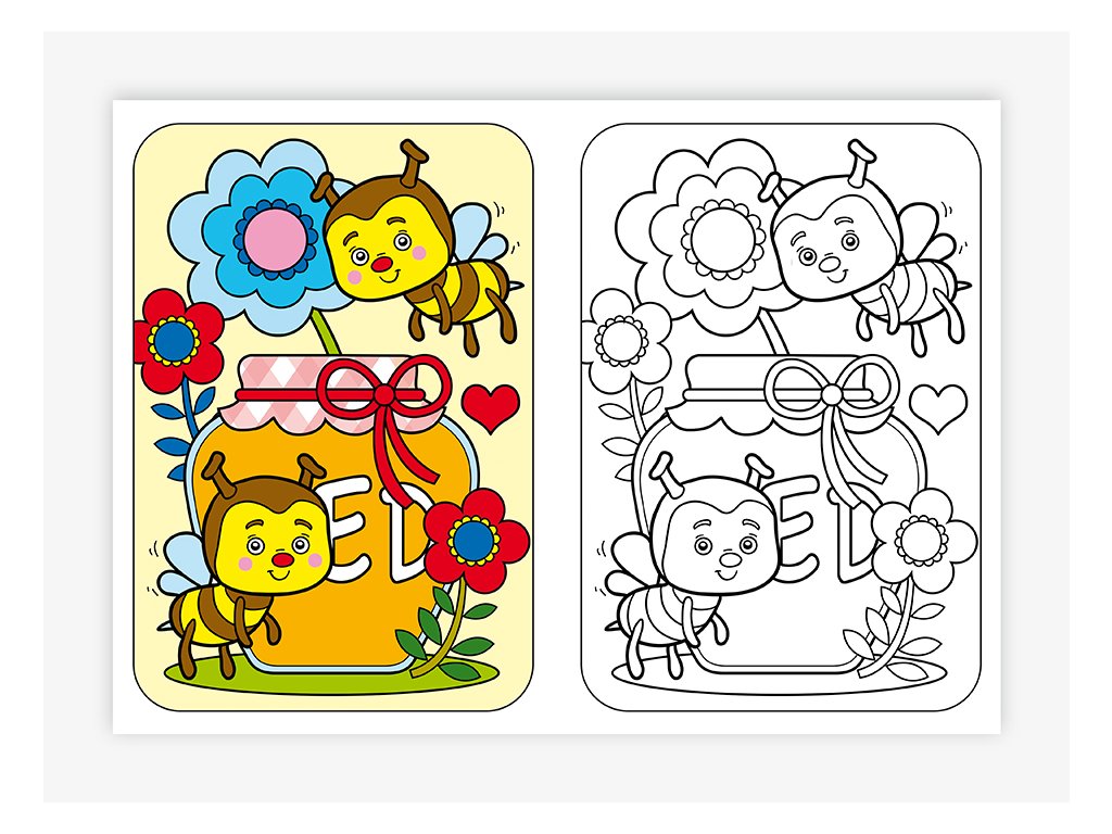 Osm stran barevné předlohy a osm stran k vybarvování, formát A5.