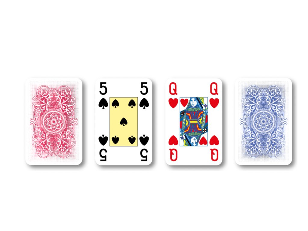 Rummy senior - mezinárodní populární vzor s reversem ve tvaru krajky v modrém a červeném provedení. Zvýrazněné identifikační prvky na kartách umožňují lepší orientaci ve hře i seniorům.