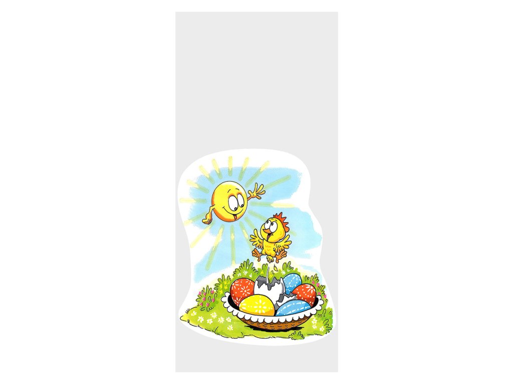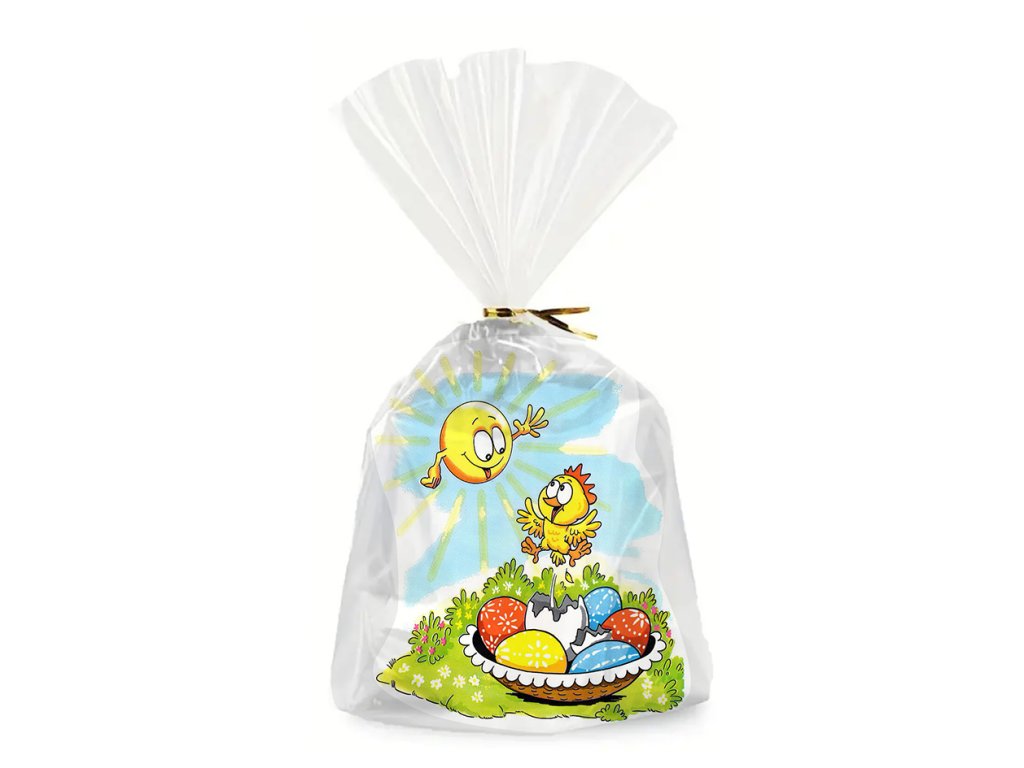 Z přední strany je motiv kraslic s kuřátkem a z druhé strany je velikonoční sáček čirý.