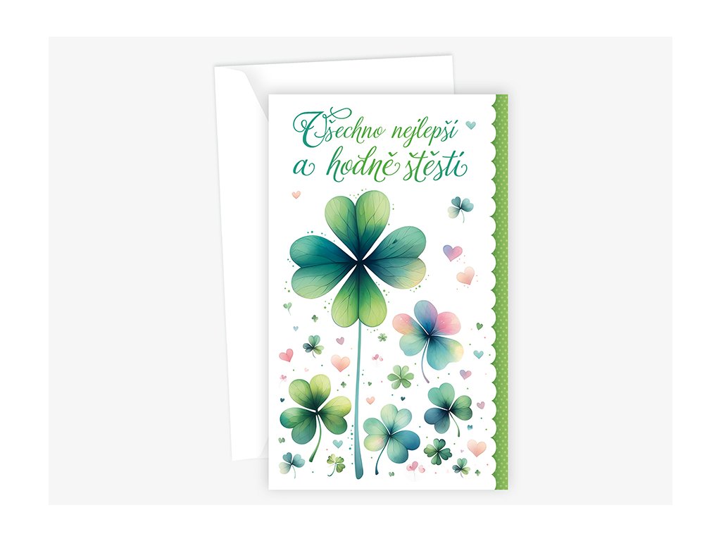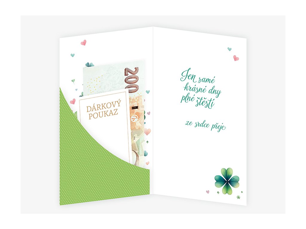 Srdečné blahopřání s kapsou na peníze a textem uvnitř přání. Součástí blahopřání je bílá obálka.