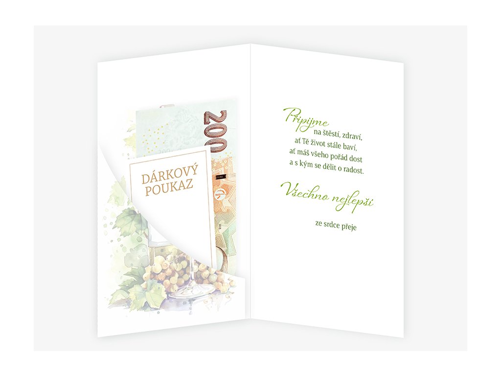 Text uvnitř: Připijme na štěstí, zdraví, ať Tě život stále baví, ať máš všeho pořád dost a s kým se dělit o radost. Všechno nejlepší ze srdce přeje