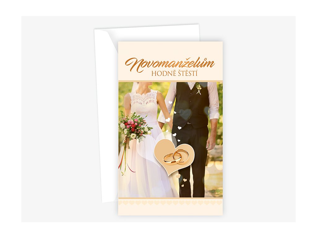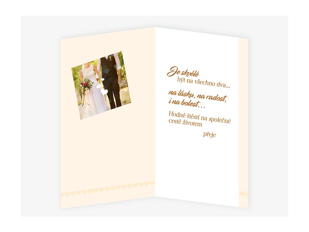 Svatební blahopřání s textem uvnitř přání. Součástí blahopřání je bílá obálka.