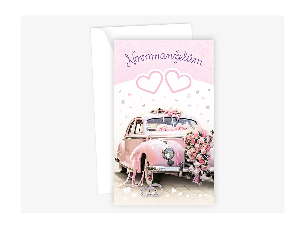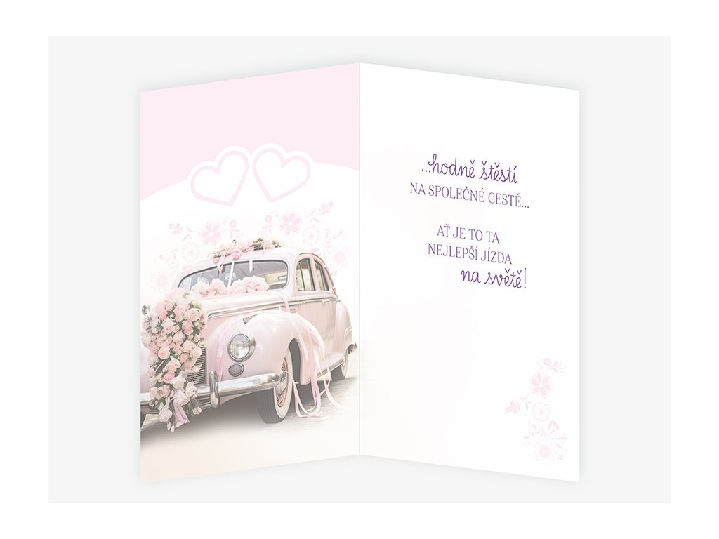 Svatební blahopřání s textem uvnitř přání. Součástí blahopřání je bílá obálka.