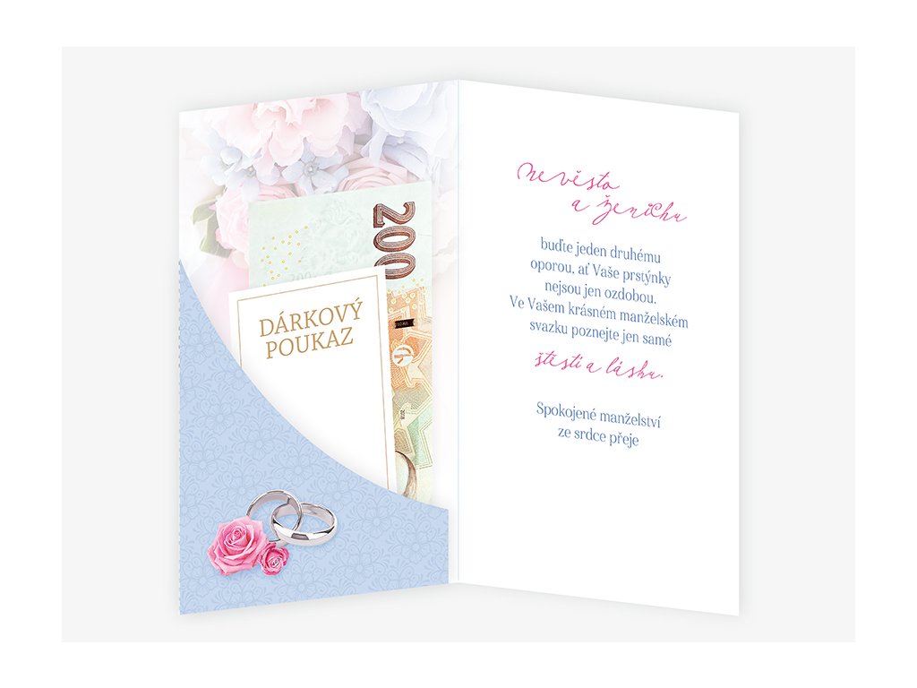 Svatební blahopřání s kapsou na peníze a textem uvnitř přání. Součástí blahopřání je bílá obálka.