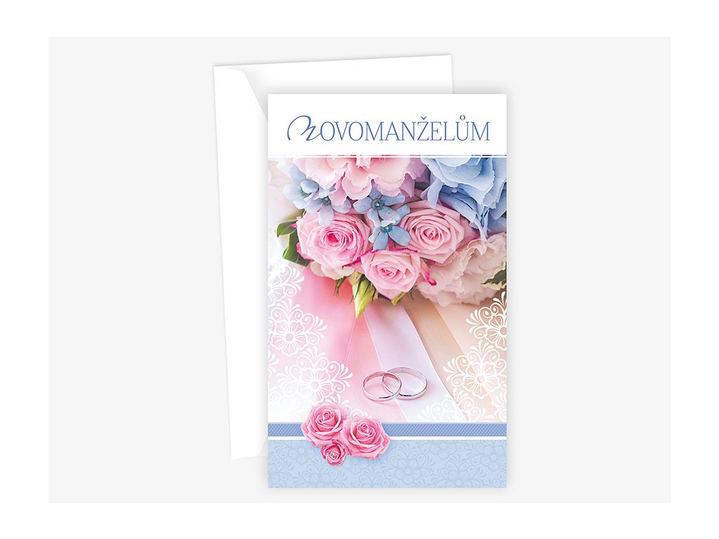 Text uvnitř: Nevěsto a ženichu buďte jeden druhému oporou, ať Vaše prstýnky nejsou jen ozdobou. Ve Vašem krásném manželském svazku poznejte jen samé štěstí a lásku. Spokojené manželství ze srdce přeje