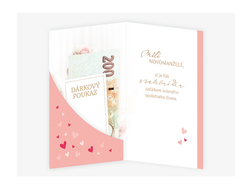 Svatební blahopřání s kapsou na peníze a textem uvnitř přání. Součástí blahopřání je bílá obálka.