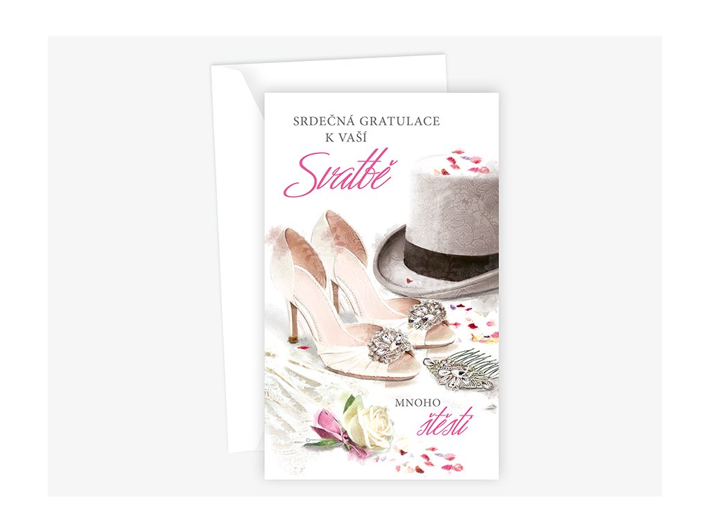Svatební blahopřání s textem uvnitř přání. Součástí blahopřání je bílá obálka.