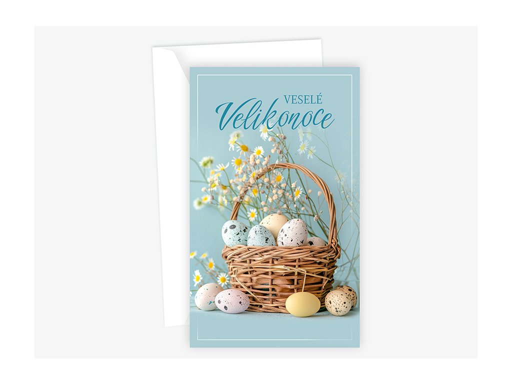 Velikonoční přání s textem uvnitř přání. Součástí velikonočního přání je bílá obálka.