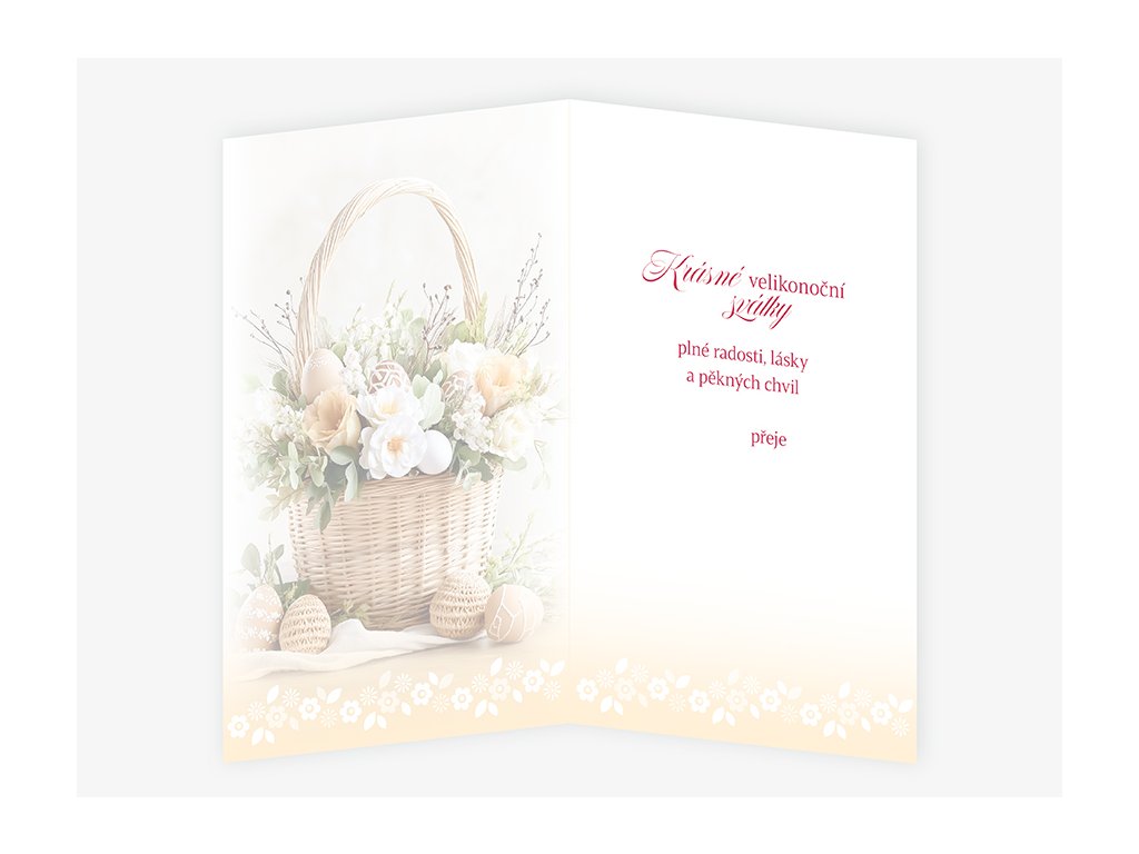 Velikonoční přání s textem uvnitř přání. Součástí velikonočního přání je bílá obálka.
