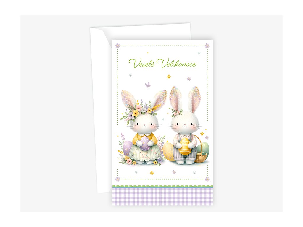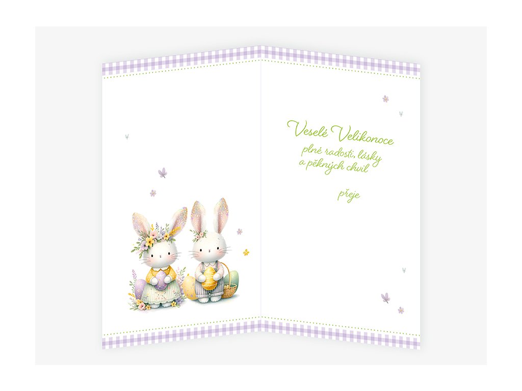 Velikonoční přání s textem uvnitř přání. Součástí velikonočního přání je bílá obálka.